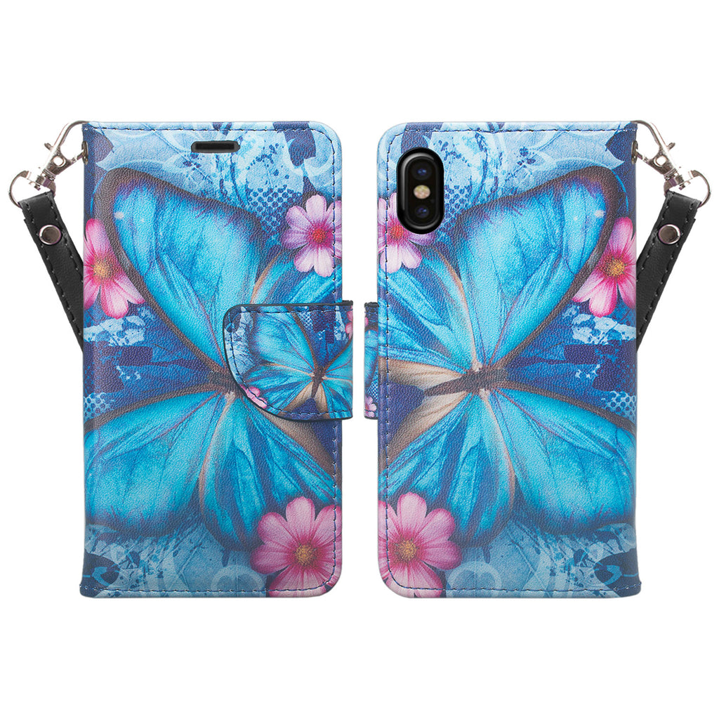 Apple iPhone ??? | iPhone Ten Case, iPhone ??? | iPhone Ten Wallet Case, Slim Flip Folio [Kickstand] Pu Leather Wallet Case with ID & Card Slots & Pocket + Wrist Strap - Blue Butterfly