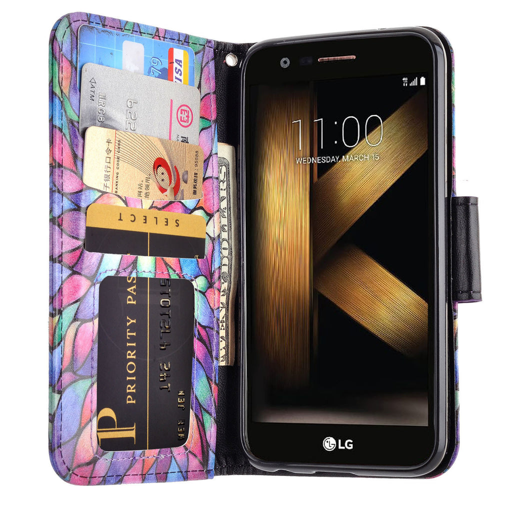 LG K20 Plus Case, LG K20 V, K10 2017 Wrist Strap Pu Leather Magnetic Flip Fold[Kickstand] Wallet Case with ID & Card Slots - Rainbow Flower