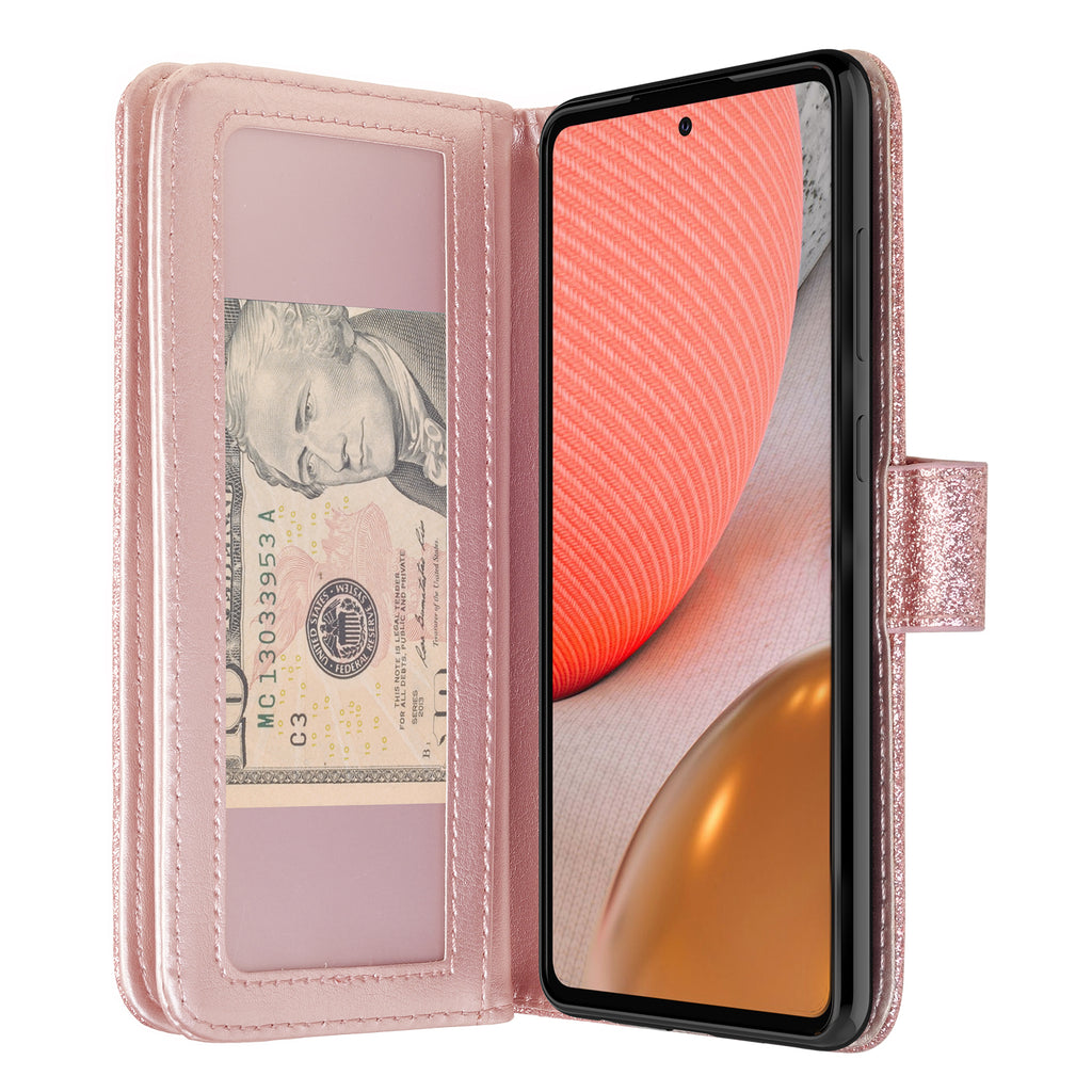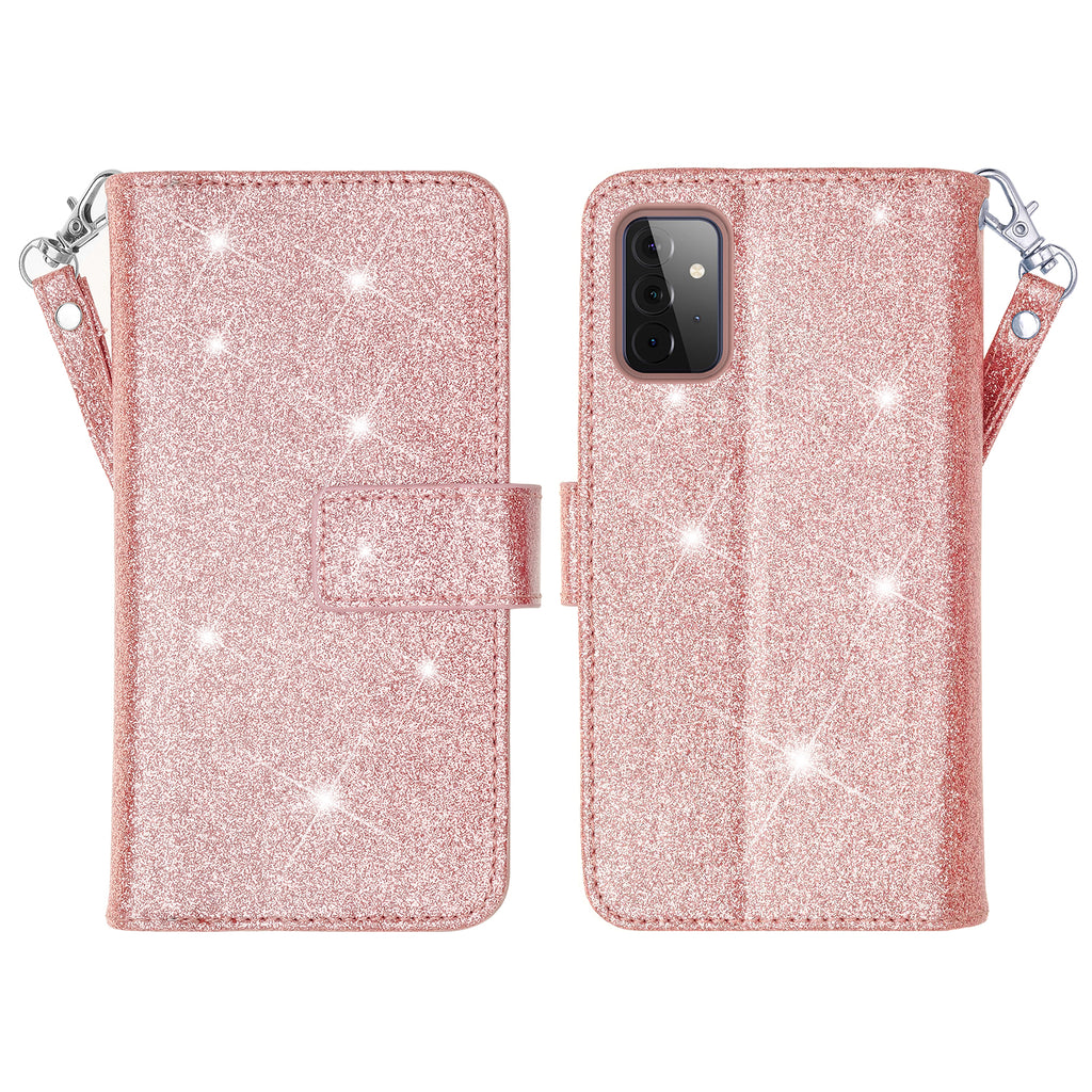 Samsung Galaxy A02s Case, Galaxy A02s Case, Glitter Faux Leather Flip Credit Card Holder Wrist Strap Shockproof Protective Wallet Case Clutch for Galaxy A02s - Rose Gold