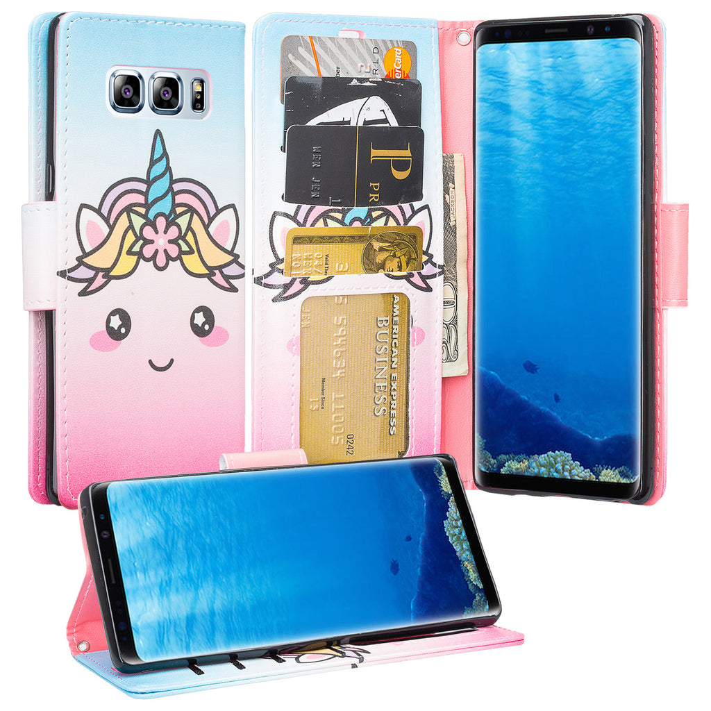Samsung Galaxy Note 8 Case, Galaxy Note 8 Wallet Case, Slim Flip Folio [Kickstand] Pu Leather Wallet Case with ID & Card Slots & Pocket + Wrist Strap - White Unicorn