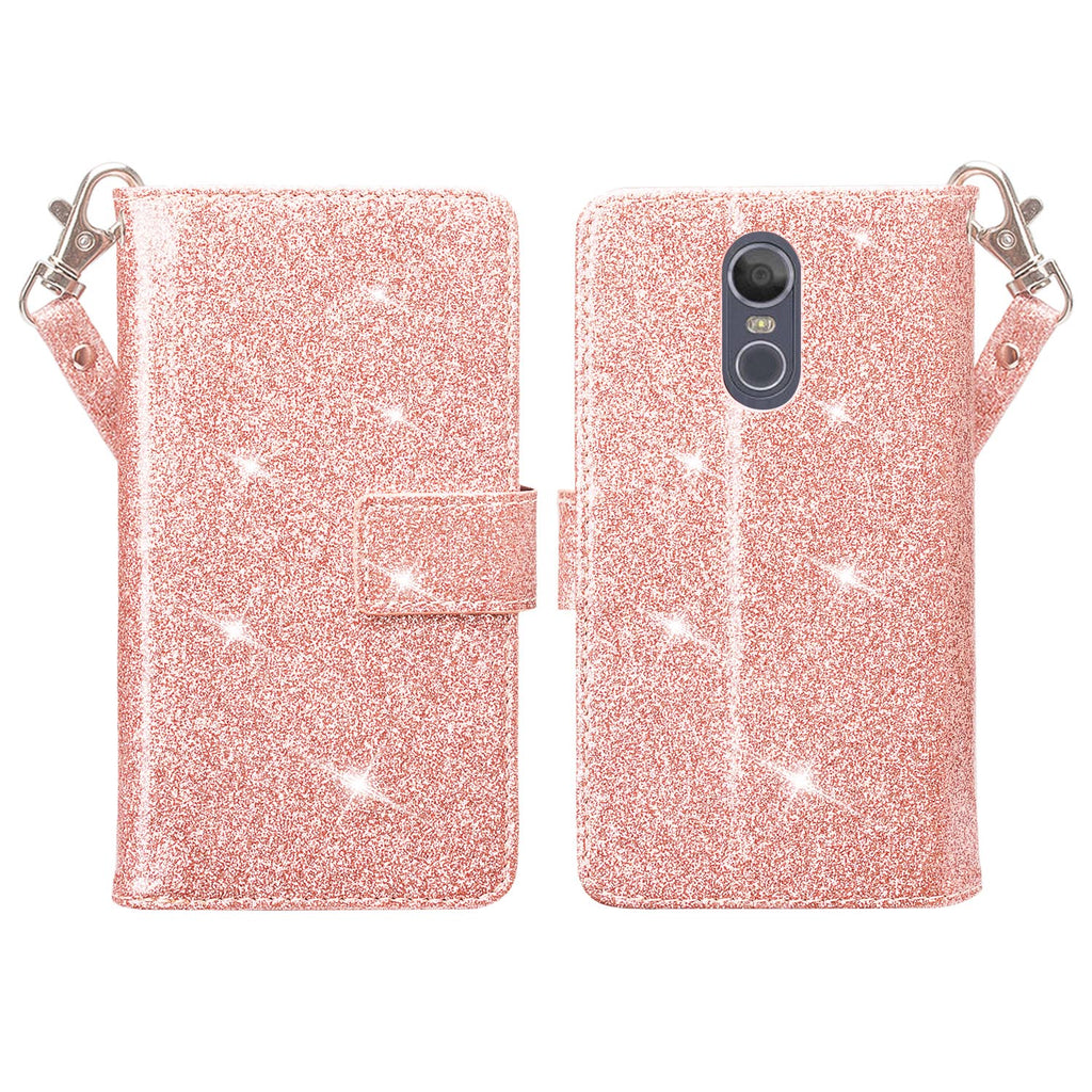Stylo 4 Case, LG Stylo 4 Case, Glitter Faux Leather Flip Credit Card Holder Wrist Strap Shockproof Protective Wallet Case Clutch for LG Stylo 4 - Rose Gold